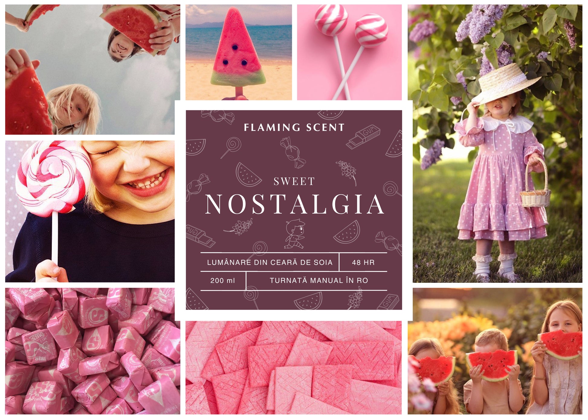 Descriere aroma: Sweet Nostalgia îți trezește cele mai dragi amintiri, readucând în interiorul tău acele momente de veselie și puritate ale copilăriei. Notele revigorante de pepene roșu și bubblegum te întâmpină jucăuș, în timp ce aroma delicată de liliac și profunzimea boabelor de tonka creează o atmosferă călduroasă şi blândă. La final, o adiere dulce de vanilie și caramel completează experiența cu un farmec liniștitor, transformând orice încăpere într-un mic refugiu nostalgic al copilăiei.